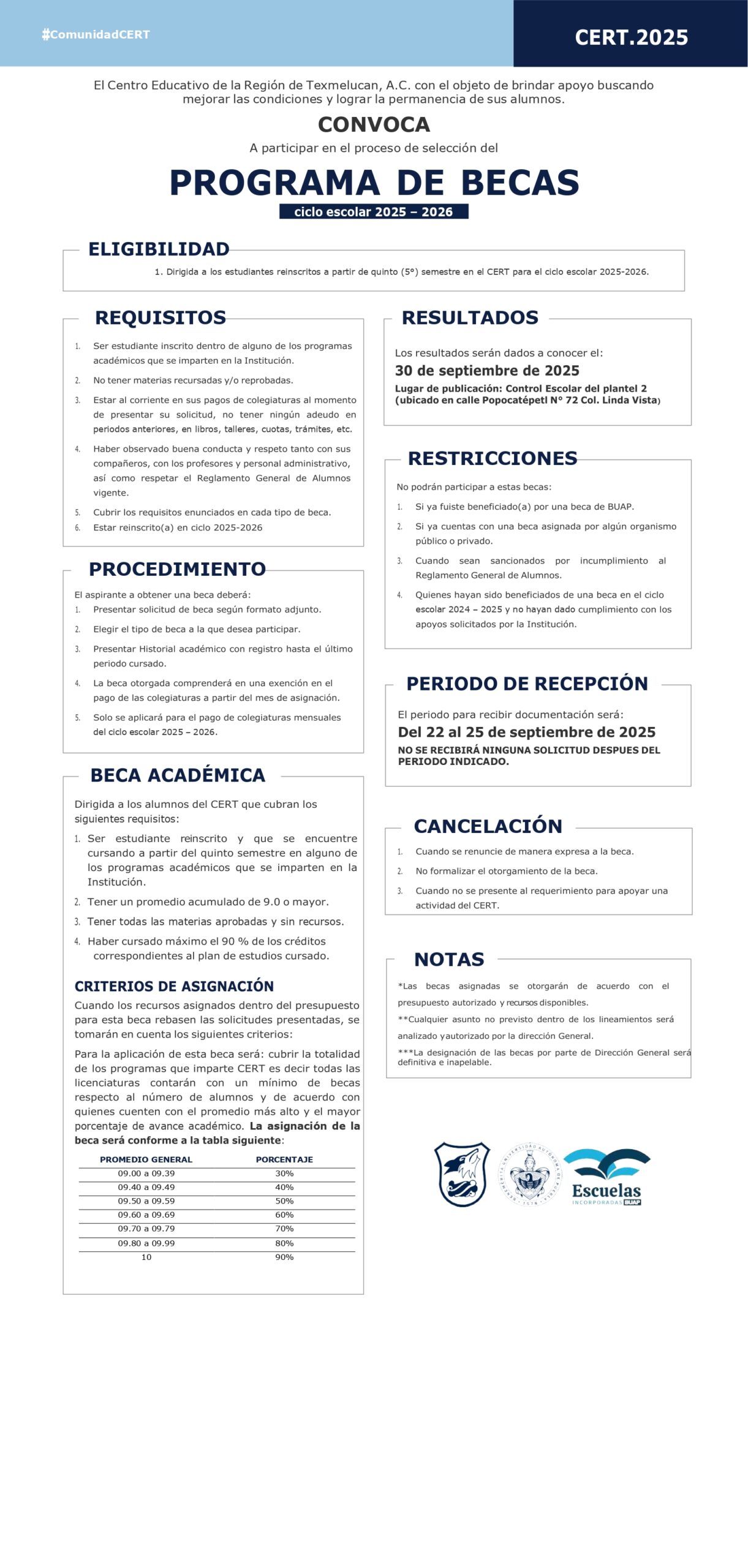 El Centro Educativo de la Región de Texmelucan, A.C. con el objeto de brindar apoyo buscando mejorar las condiciones y lograr la permanencia de sus alumnos a fin de continuar y concluir sus estudios convoca a participar en el proceso de selección del Programa de becas 2025